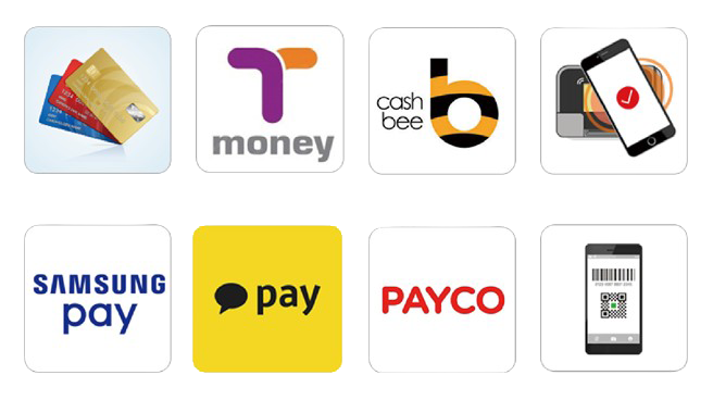 신용카드(국내, 해외카드사), T-money, Cashbee, 선불카드, 스마트폰 결제 (삼성페이, 카카오페이, Payco)및 QR코드 결제 등 다양한 방식의 결제
